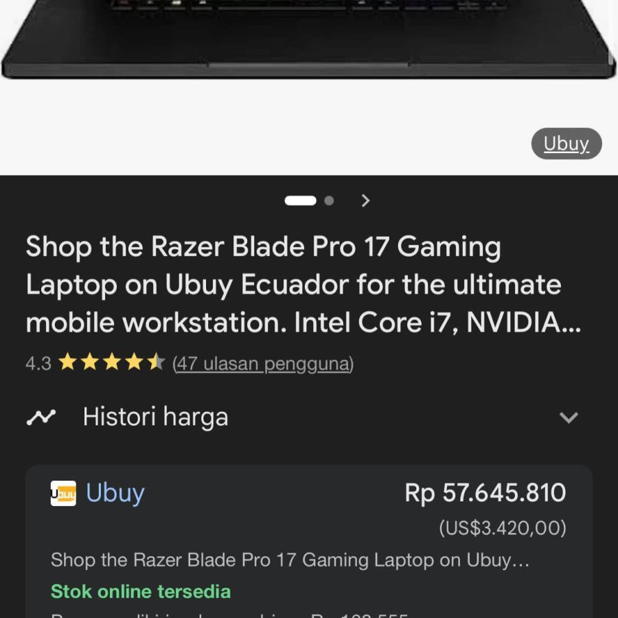 | Lainnya | Baru landing laptop gaming superr powerfull i9 dipadukan RTX 3080 16GB pastinya libass semua gaming rata kanan plus rendering Layar luass 17 inch resolusi 4k plus refresh rate 120hz joss banget Cek harga barunya dipostingan 57 jutaan Datang hanya 1 unit aja boskuh Razer Blade 17 (Mid 2021) RZ09-0406 * Processor Intel Core i9-11900H (16CPU) ~2.5GHz * RAM 16GB * SSD 512GB * Dipslay 17.3-inch Resolution 4K Refresh Rate 120Hz * VGA Nvidia GeForce RTX 3080 Vram 16GB * Keyboard Backlight * Interfaces Audio Jack 3.5mm,HDMI, Thunderbolt 4, USB 3.2 Type C, USB 3.2 Type A, RJ-45 Port * Webcam, Wifi * Kondisi Body Mulus Grade A, Mesin Lancar Jaya * Kelengkapan Unit, Carger Bonus Tas Optional |